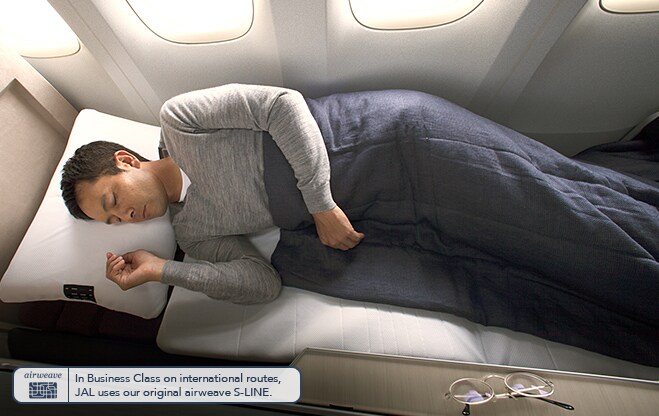 日本航空(JL)自01/01/2014起,於JAL SKY SUITE 777(SS7)頭等艙提供airweave最新DUAL MODE系列床墊與枕頭。
